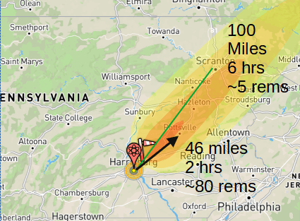 From what I remember, the Soviet protocols were to drop two nukes on each state capitol city. Assuming they can still hit the broad side of a barn, their missiles are at 100% capacity, the above image demonstrates the estimated fall out pattern of a 1 megaton device. The Topol nuclear ICBM, carries a 800 kiloton device, the difference will be slightly less than the image shows.